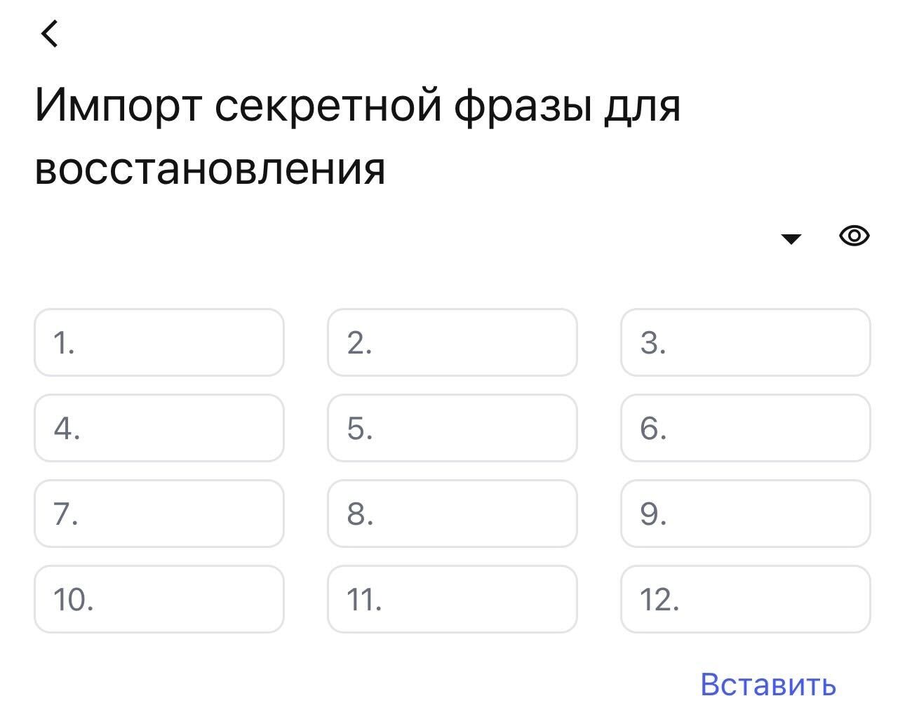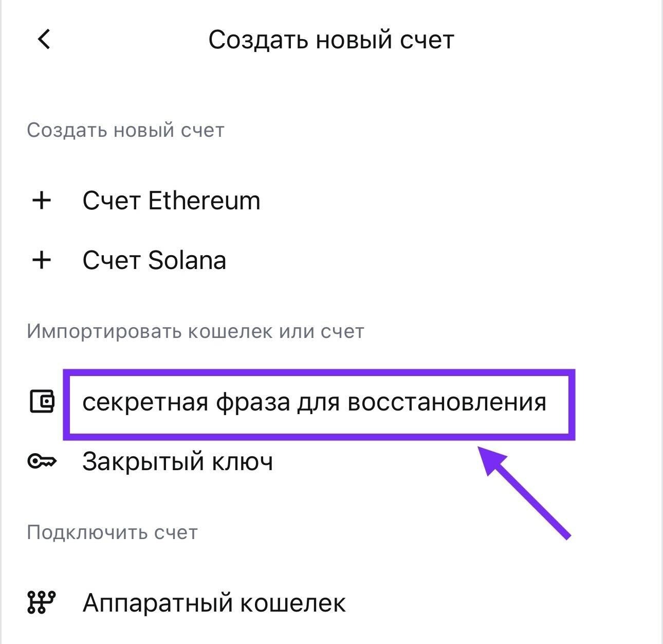 - Выбери «Импортировать кошелек или счет» → «Секретная фраза для восстановления»
