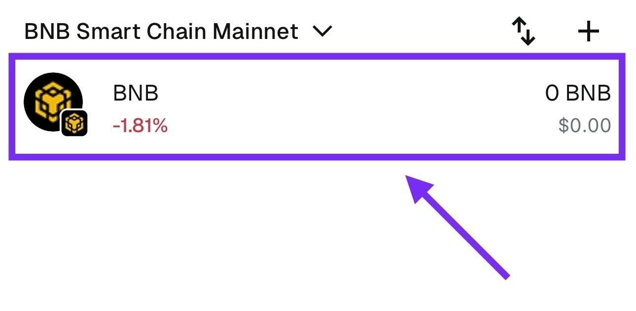 - Нажми на токен BNB (убедись, что у тебя выбрана сеть BEP-20)