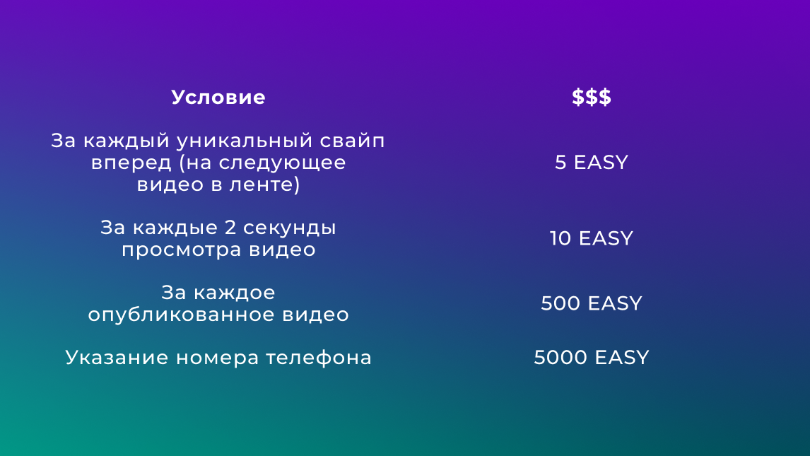 Ты получаешь EASY за следующие действия в приложении: